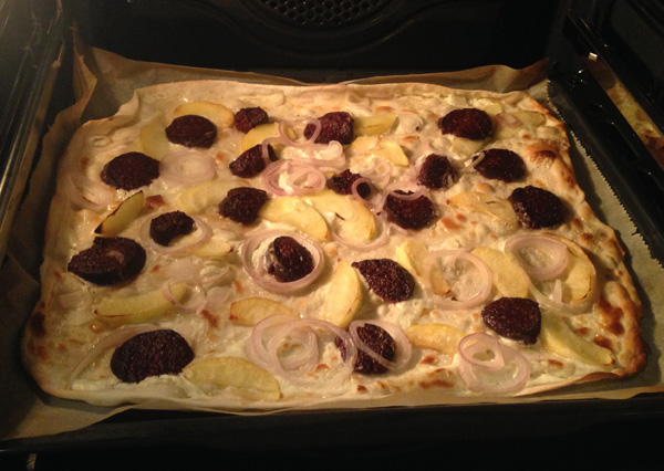 M. nannte diesen geflämmten Kuchen Himmel und Äd-Flammkuchen und kommt dem ganzen schon ein Stück näher. Für mich ist er eine gelungene Melange aus dem Elsaß und Köln, ein gut integrierter Immigrant. Diese tarte flambée wurde mit Schmand, gedünsteten Apfelstücken, Zwiebeln und Blutwurst belegt. Keine optische Schönheit, aber gut und mit Substanz, so wie die Stadt Köln. Frankophil ist man ja im Rheinland und speziell in Köln sowieso, man geht ja schließlich auf dem Trottoir und nicht auf einem Bürgersteig und den Parapluie hat man vorsichtshalber auch dabei.