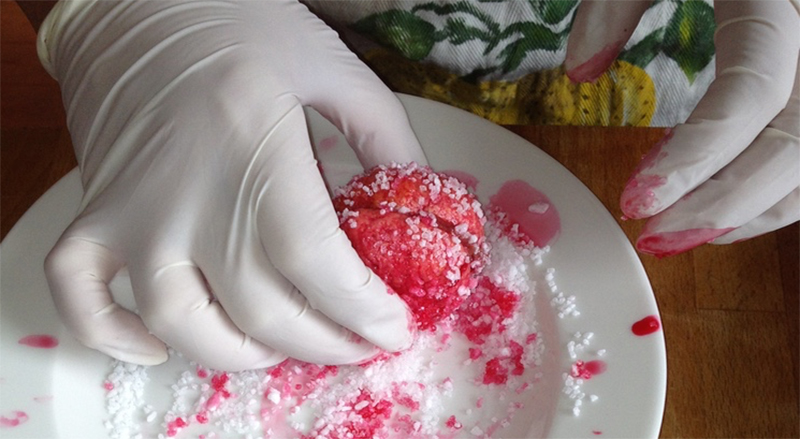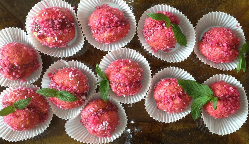 Dann in Alchermes tunken. Alchermes ist ein italienischer Bitterlikör, der Campari ähnelt, aber süßer ist und fast ausschließlich für die Patisserie genutzt wird.